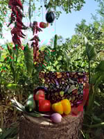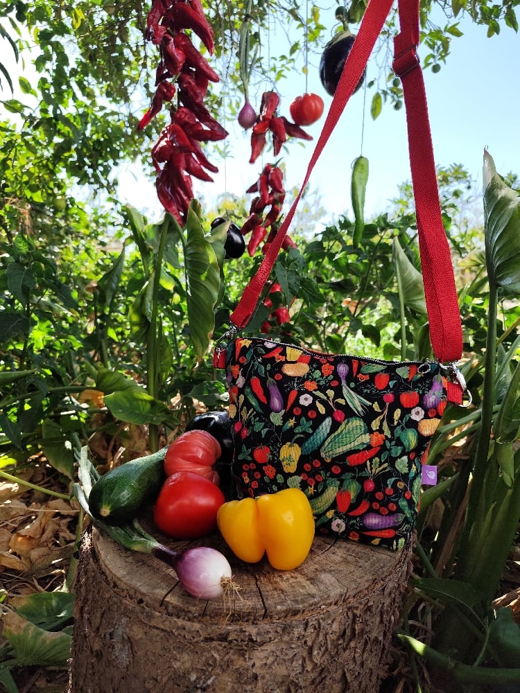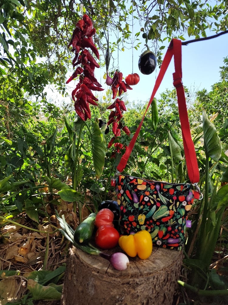 Diseño propio del estampado HUERTA: un homenaje a la tierra, a mis raíces, al campo de mis padres y a la importancia de las manos que cultivan la tierra. Una huerta de verano para lucirla en cualquier temporada , algo así como verduras de temporada en conservas.