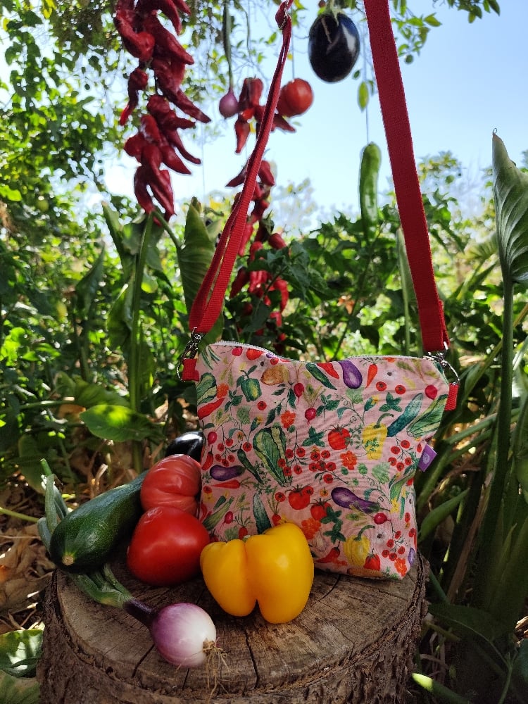 Diseño propio del estampado HUERTA: un homenaje a la tierra, a mis raíces, al campo de mis padres y a la importancia de las manos que cultivan la tierra. Una huerta de verano para lucirla en cualquier temporada , algo así como verduras de temporada en conservas.