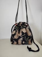Forrado en vicky blanco y negro y cierre de cordón. Asas de quitan y pon en cordón de algodón. Enganche para llaves o neceser en su interior.