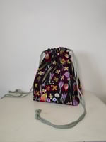 Forrado en vicky blanco y negro y cierre de cordón. Asas de quitan y pon en cordón de algodón. Enganche para llaves o neceser en su interior.