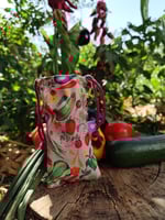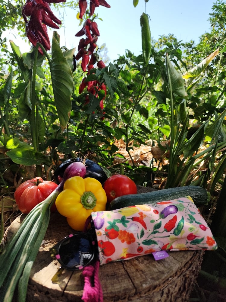 Diseño propio del estampado HUERTA: un homenaje a la tierra, a mis raíces, al campo de mis padres y a la importancia de las manos que cultivan la tierra. Una huerta de verano para lucirla en cualquier temporada , algo así como verduras de temporada en conservas.