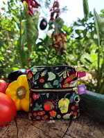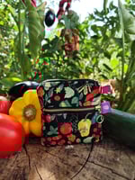 Diseño propio del estampado HUERTA: un homenaje a la tierra, a mis raíces, al campo de mis padres y a la importancia de las manos que cultivan la tierra. Una huerta de verano para lucirla en cualquier temporada , algo así como verduras de temporada en conservas.