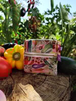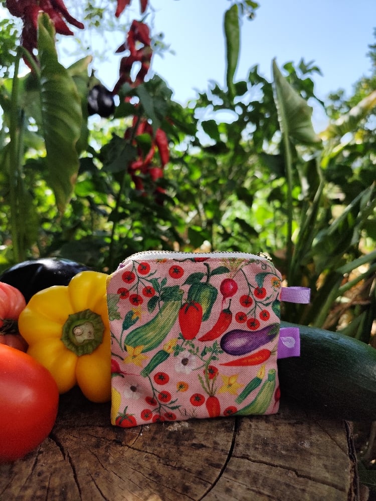 Diseño propio del estampado HUERTA: un homenaje a la tierra, a mis raíces, al campo de mis padres y a la importancia de las manos que cultivan la tierra. Una huerta de verano para lucirla en cualquier temporada , algo así como verduras de temporada en conservas.