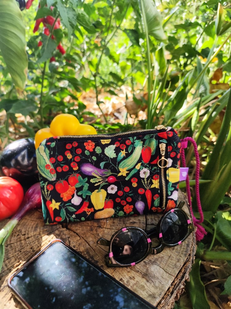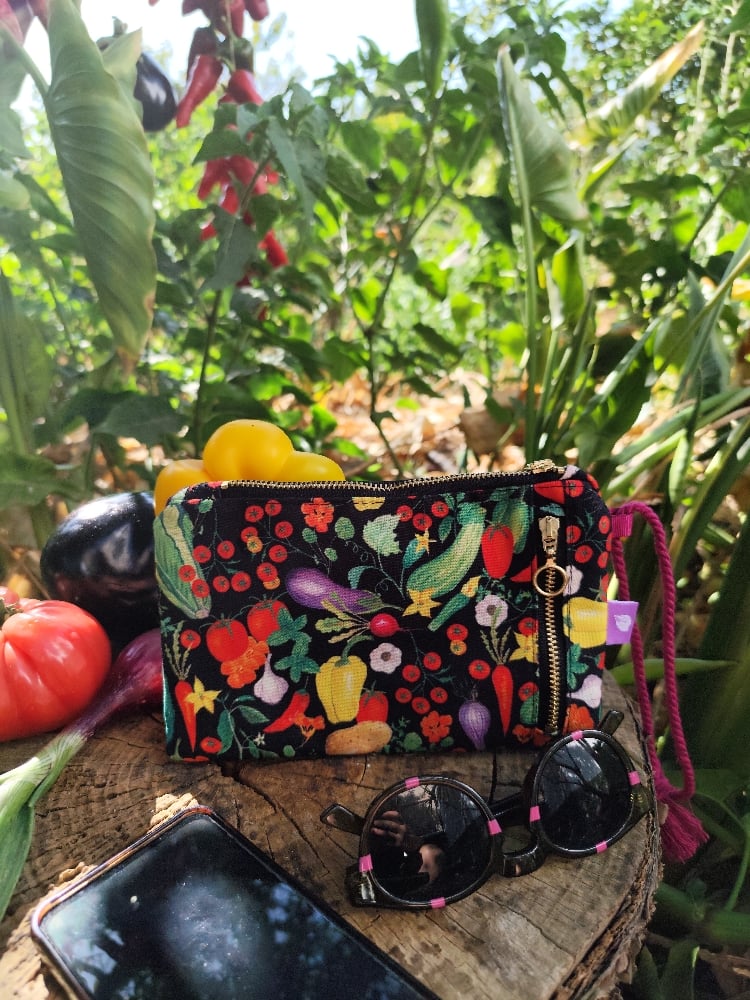 Diseño propio del estampado HUERTA: un homenaje a la tierra, a mis raíces, al campo de mis padres y a la importancia de las manos que cultivan la tierra. Una huerta de verano para lucirla en cualquier temporada , algo así como verduras de temporada en conservas.