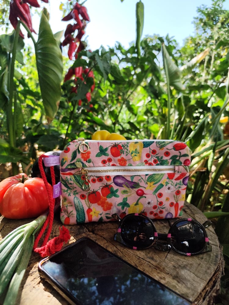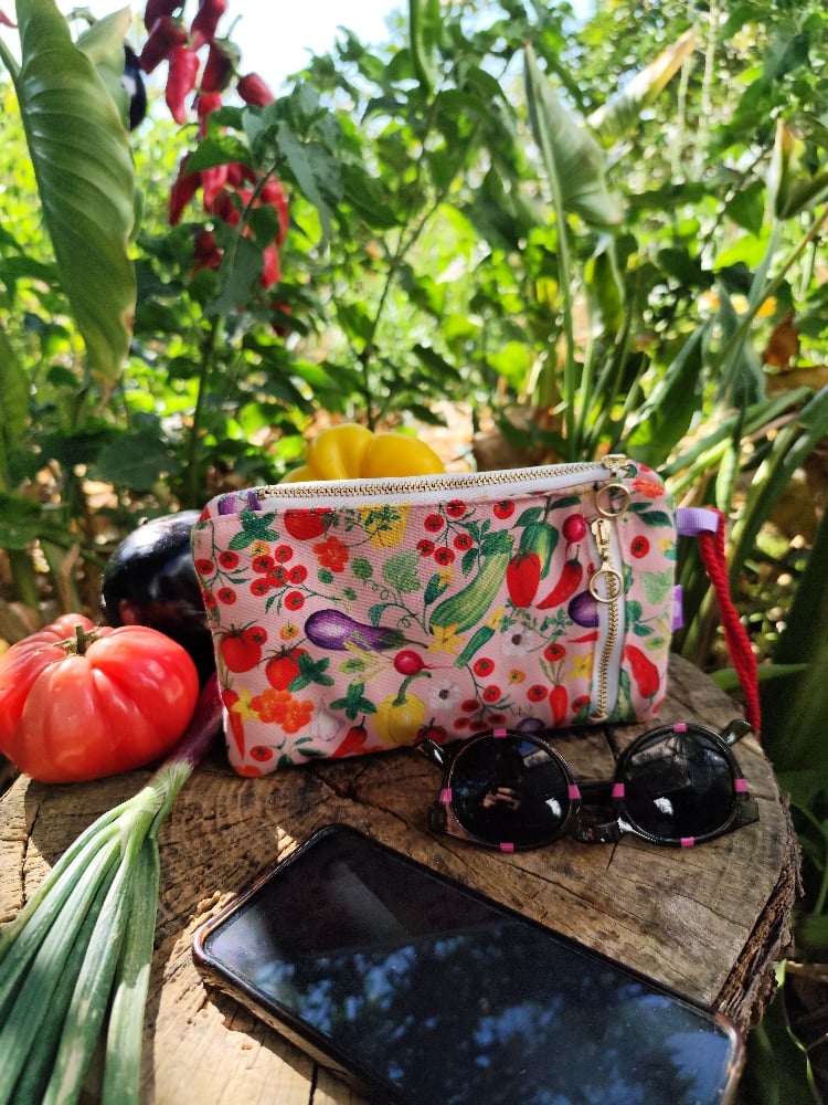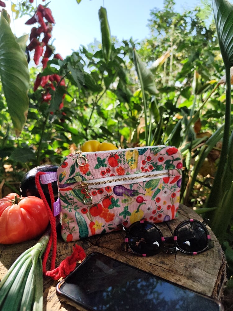 Diseño propio del estampado HUERTA: un homenaje a la tierra, a mis raíces, al campo de mis padres y a la importancia de las manos que cultivan la tierra. Una huerta de verano para lucirla en cualquier temporada , algo así como verduras de temporada en conservas.