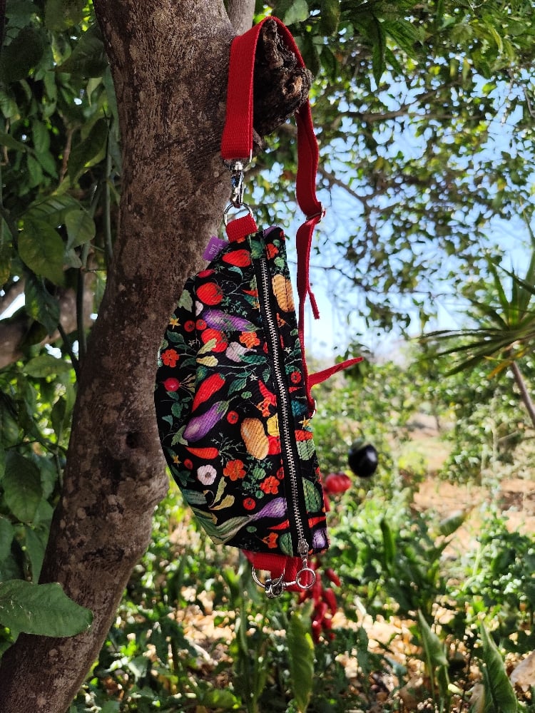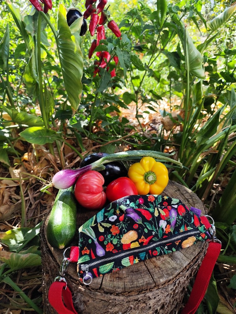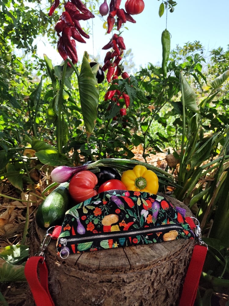 Diseño propio del estampado HUERTA: un homenaje a la tierra, a mis raíces, al campo de mis padres y a la importancia de las manos que cultivan la tierra. Una huerta de verano para lucirla en cualquier temporada , algo así como verduras de temporada en conservas.